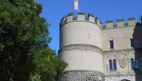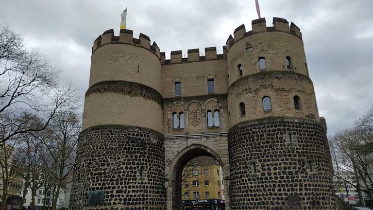 Die "Hahnentorburg", eine der ursprünglich zwölf Torburgen in der acht Kilometer langen mittelalterlichen Stadtmauer von Köln, steht auf dem Rudolfplatz im Zentrum der Stadt. Das Tor wurde in der ersten Hälfte des 13. Jahrhunderts im Zuge der dritten mittelalterlichen Stadterweiterung Kölns errichtet. Es sicherte den westlichen Zugang zur Stadt an der Straße nach Aachen und Jülich. Nach der Krönungszeremonie in Aachen betraten im Mittelalter Kaiser und Könige die Stadt durch dieses Tor, um zur Huldigung der Heiligen Drei Könige in den Kölner Dom einzuziehen. Heute beherbergt der Bau die Karnevalsgesellschaft "Ehrengarde der Stadt Köln 1902 e.V.". Homepage: https://www.koelntourismus.de/kunst-kultur/sehenswuerdigkeiten/detail/hahnentorburg
