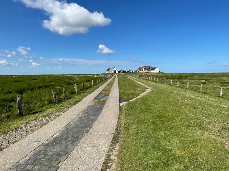 Natürlich mit dem Fahrrad sollte man diese Tour unternehmen, denn es sind hin und zurück 40 km. Man hat die Möglichkeit vor- oder hinter dem Deich zu fahren. Beide Touren sind vom Panorama her sehr schön. Nach 16 km fährt man die letzten 4 km über das Deichvorland zwischen den Salzwiesen, die mehrfach im Jahr überflutet werden. Nach ca. 2 km liegt auf einer Warft eine Naturschutzstation die meistens ehrenamtlich besetzt ist und wo man viel Informationen über den zum Weltkulturerbe erklärten Nationalpark Schleswig-Holsteinisches Wattenmeer erfährt.