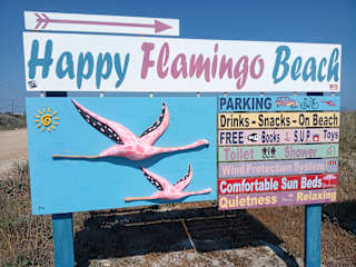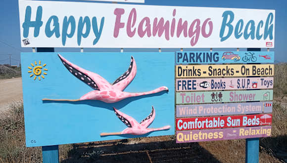 Dieser Teil des Strandes gehört Christos, einem Einheimischen und seiner deutschen Frau. Sie haben sich viel Mühe gegeben diesen Strandabschnitt in Schuss zu bringen. Die Liegen und Sonnenschirme (pro Platz 10EURO/Tag) sind es auch wert. Man bekommt Spielsachen für die Familie kostenlos zum Ausleihen. Stand up paddling ist ebnfalls kostenfrei. Anders als bei anderen Abschnitten ist dieser Teil nicht so überlaufen und man kann dort auch essen bestellen. Es lohnt sich wirklich den Happy Flamingo Beach aufzusuchen.