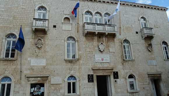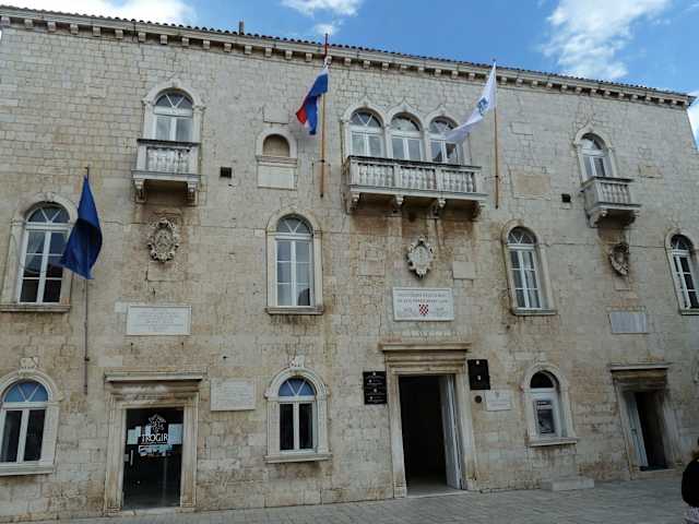 Wenn man durch das Landtor die Altstadt betritt, biegt man nach links ein, dann die 2. Straße nach rechts und steht nun auf dem Hauptplatz von Trogir, dem Trg Ivana Pavla II (Papst Johannes Paul II.) Rund um diesen Platz stehen die bedeutendsten Bauwerke von Trogir, wie z.B. die Kathedrale St. Laurentius (Sveti Lovre), der Uhrturm des Hl. Sebastian mit der Stadt-Loggia, die Kirche St. Barbara und der Cipiko Palast. Dieser Platz ist sozusagen der kulturelle und kunsthistorische Mittelpunkt von Trogir. An der Nordseite steht die Kathedrale St. Laurentius mit ihrem hoch aufragenden Glockenturm, dessen Bau über 100 Jahre dauerte und der die wechselnden Baustile zeigt. Auf der Turmspitze befinden sich vier Figuren eines venezianischen Bildhauers. Den Turm kann man besteigen (kostenpflichtig) und hat dann einen wunderbaren Blick über die Stadt und den Hafen. Auf der Südseite des Marktplatzes steht die Stadtloggia aus dem 15. Jahrhundert. Im ausgehenden Mittelalter diente die Loggia als Gerichtsstätte. Ein schönes Wandrelief von venezianischen Bildhauern über dem Gerichtstisch verdient Aufmerksamkeit. Sehenswert ist auch die farbig gestaltete Kastendecke. Der Uhrturm war in früherer Zeit ein Glockenturm der ehemaligen Kirche des hl. Sebastian und ist heute ein eigenständiges Bauwerk. Der Turm mit seiner beeindruckenden Uhr wurde um 1477 erbaut. An der Ostseite des Platzes befindet sich das Rathaus der Stadt (15. Jh.). In dem früheren Rektorenpalast regierte einst der venezianische Stadthalter. Gegenüber dem Dom, an der Stirnseite Trg Ivan Pavla II, liegt die Patrizierwohnung der Familie Cipiko, ein Meisterwerk, welches den Übergang der Gotik zur Renaissance exemplarisch zeigt. Vor den dortigen Cafés kann man wunderbar einen Cappuccino genießen und dem Treiben auf dem Platz zuschauen
