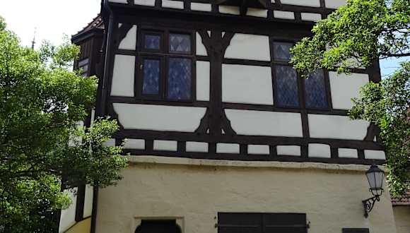 Das Gebäude stammt aus dem 15. Jahrhundert und wurde wenige Jahre nach Erstellung von Graf Eberhard im Bart gekauft. Neben der Fassade zur Straße hin fällt an der Seite auch ein schöner Anbau für die Treppe auf.