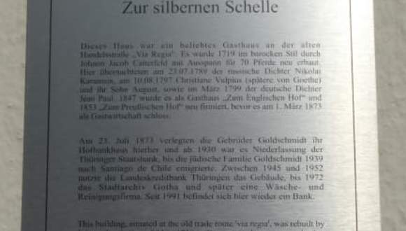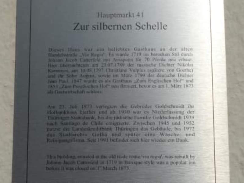 Am Hauptmarkt fällt sicherlich das schöne, sehenswerte Haus mit der Nr. Hauptmarkt 41 auf. Dieses Gebäude wurde im Jahr 1719 anstelle eines älteren Gebäudes errichtet. Es war unter dem Namen „Haus Zur Silbernen Schelle“ ein beliebtes Gasthaus (mit der Möglichkeit zur Unterstellung für die Pferde der Reisenden). Später wurde der Name des Gasthauses mehrfach geändert (Zum Englischen Hof und Zum Preußischen Hof), bis es Anfang 1873 geschlossen wurde. Noch im Jahr 1873 zogen die Brüder Goldschmidt mit ihrer Bank, dem Hofbankhaus, in dieses Gebäude ein. 1930 erfolgte eine Fusionierung zwischen dem Hofbankhaus und der Thüringer Staatsbank. 1939 musste die jüdische Familie Goldschmidt emigrieren (sie flüchteten nach Santiago de Chile) und konnte sich dadurch vor einer möglichen / wahrscheinlichen Ermordung durch das NAZI-Regime retten. Nach dem Zweiten Weltkrieg war in dem Haus Zur Silbernen Schelle zwischen 1945 und 1952 die Landeskreditbank Thüringen untergebracht. Danach war bis 1972 das Stadtarchiv von Gotha in diesem Gebäude und danach schließlich eine Reinigung. Seit 1991 ist nun wieder eine Bank im Hauptmarkt 41, dem „Haus Zur Silbernen Schelle“.