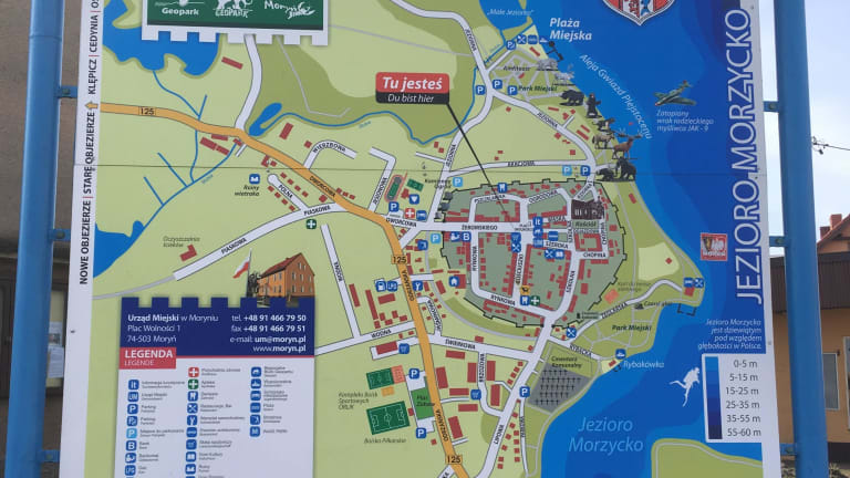 Moryn ca 90 Km von Berlin entfernt über Hohenwutzen in Richtung Cedynia dann auf der Fernstraße 125 ca 16 Km bis Moryn. An den gleichnamigen See gelegen, der der Interessanteste See Polens ist. Es ist ein Ort der geschichtlich 972 in Verbindung mit Zehden und dem brandenburgischen eng verbunden benannt und bekannt ist. Diese geschichtlichen Aspekte begegnen einem in der kleinen Stadt . Vor dem Rathaus der kleinen Stadt kann das Wahrzeichen in Form eines Krebses auf dem Brunnen in Augenschein genommen werden. Die Kirche, konnten wir leider nur von Außen betrachten, schade!!!! Aber dafür ist das polnisch- deutsche Projekt des Geo Parks am Moryner See der 2012 eröffnet wurde ein Erlebnis - und informatives Projekt, dass man hier nie erwarten würde. Auch mussten wir feststellen, dass es auch zu dieser Jahreszeit ein sehr gepflegten Eindruck hinterlässt.