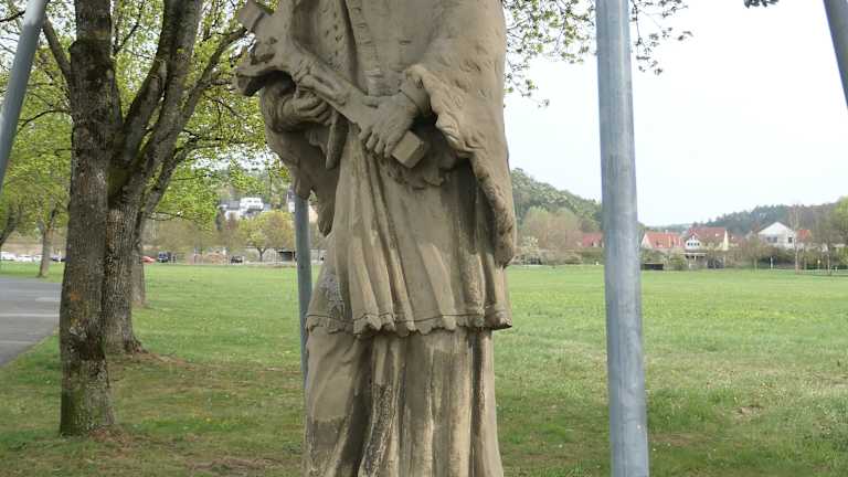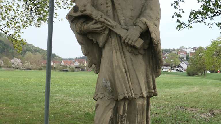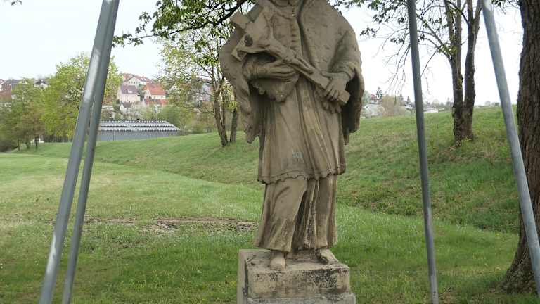 Unterhalb der Brücke der Mühlbacher Straße steht eine Heiligenfigur, die Johannes Nepomuk darstellt. Es ist eine durchaus interessante Heiligenfigur, die sich hier in der Grünanlage befindet.