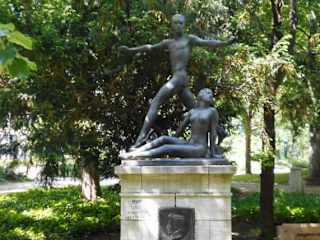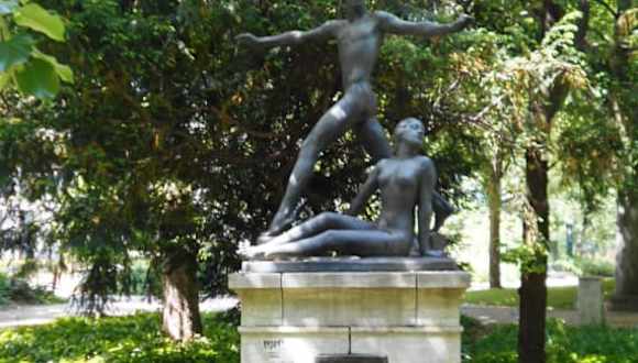 Angeblich inspiriert von den russischen Balletttänzern Vaslav Nijinsky und Tamara Karsavina schuf der Bildhauer Georg Kolbe dieses Heine-Denkmal, das nicht Heinrich Heine darstellen soll, sondern die Leichtfertigkeit und Eleganz seiner Werke symbolisiert.