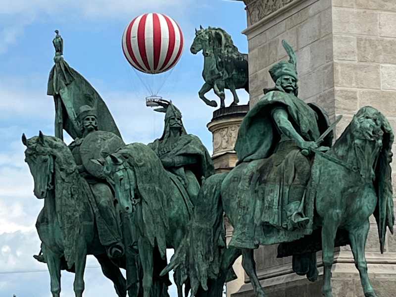 Die im Halbkreis zwischen den Säulen angeordneten Standbilder von Königen, Herrschern und anderen bedeutenden Personen sind ein imposanter Anblick, dazu im Zentrum des Platzes die Säule des Millenniumsdenkmals mit dem Erzengel Gabriel auf der Spitze und den sieben Häuptlinge der Magyaren – der Platz ist in der Tat voller Helden und wirkt sehr beeindruckend.
