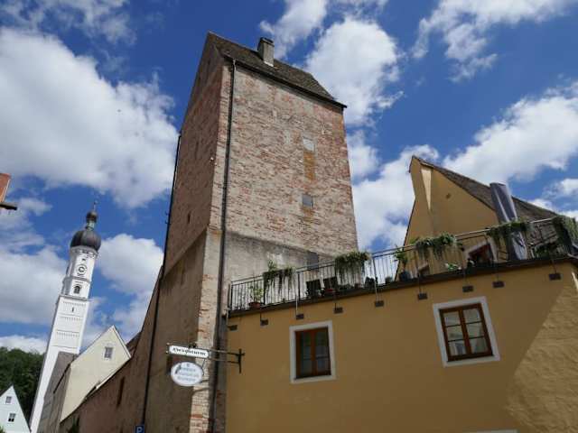 Der Hexenturm ist in seiner alten Ansicht nicht die wahre Schönheit, aber da er Teil der Stadtmauer ist, wollte man ihn wahrscheinlich nicht verschönern. Auch konnten wir die Bezeichnung Hexenturm nicht ermitteln, aber ich vermute, daß man wie in anderen alten Städten, hier die vermeintlichen Hexen eingekerkert hatte. Der Turm ist ganz in der Nähe des "Baches", also eines Fliessgewässers, welches vom Lech abgespalten wurde. Der Bach wird dann am Färberhof wieder mit dem Lech vereint.