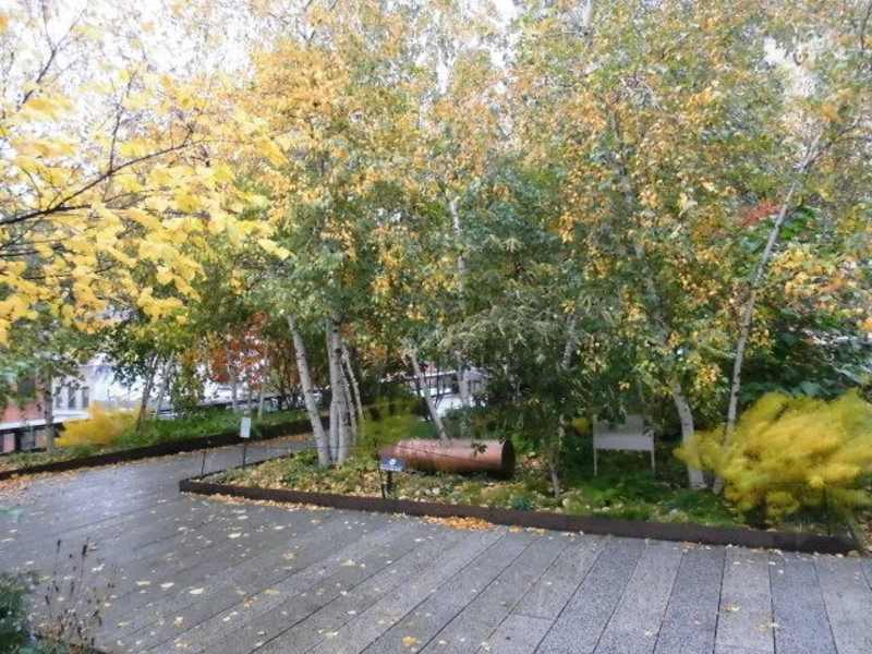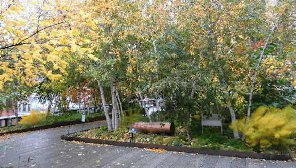 In New York City ist - wie allseits bekannt - der Platz begrenzt und wertvoll. So ist man früher schon in die Höhe gegangen, hat den Zug auf die erste Etage - auf Stelzen - versetzt. Diese Zeit ist nun schon lange vorbei, wo man die Metro in den Untergrund verbaut hat. Aber einige diese Trassen auf Stelzen waren noch vorhanden - besonders im Meat-Packing District. Und die hat man in den letzten Tagen umgewandelt in eine Parkanlage, den Highlinepark. Dort haben wir jetzt den Herbst erlebt - mit seiner herbstlichen Laubfärbung und der nebligen Stimmung. Am neuen Whitney Museum nahmen wir den Aufzug nach oben und standen direkt zwischen Birkenbäumchen im gelblichen Laub. Von hier blickten wir zurück und hinunter auf den Hot dog Stand, wo wir uns gerade noch gestärkt hatten. An einigen Stellen liegen noch die alten Eisenbahnschienen und wenn man sich vorstellt, dass hier oben die Dampfzüge entlang ratterten - das ist schon ein komisches Gefühl. Zwischen den Bäumchen blickten wir in die Strassenzüge hinunter, dort unten bewegte sich der Verkehr - hier oben war es (relativ) ruhig. Sogar Blütenpolster leuchten noch zwischen den braunen Gräsern. Weit drüben schaut das Empire State Building zwischen den Häuserreihen hindurch. Auf halben Weg ging's dann für uns wieder nach unten, die Straße Richtung Metro nehmend. Unser Tipp: Am besten erreicht man den Highlinepark mit der Metrolinie L – das ist eine Metrolinie, die quer durch New York geht, in Brooklyn beginnt und in Manhattan 14.Str./8. Ave endet. Fahren Sie also bis zur Endstation an der 8. Ave. Und laufen von hier aus Richtung Westen – wenn Sie die Hochtrasse erreichen, müssen Sie nur noch einen Aufgang finden. Und – nebenbei gesagt – hier im Meat Packing District findet man zunehmend schöne Geschäfte.