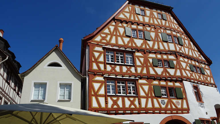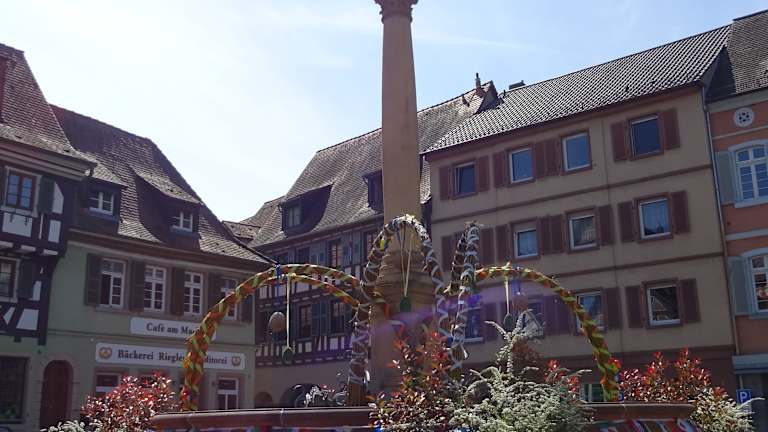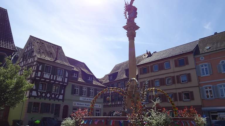 Die Stadt wurde im 13. Jahrhundert erweitert - hierbei entstand der heutige Marktplatz. Um diesen herum findet man tolle Gebäude aus der frühneuzeitlichen Zeit. Unter anderem auch ein markantes Fachwerkgebäude welches um eine mittelalterliche Wohnburg gebaut wurde. In der Mitte des Marktplatzes stand früher ein barockes Marktkreuz. Seit den 1970ern steht hier ein imposanter Marienbrunnen, welcher bei unserem Besuch als Osterbrunnen sehr aufwändig geschmückt war.