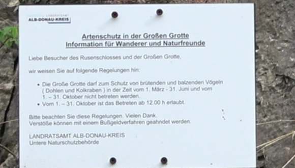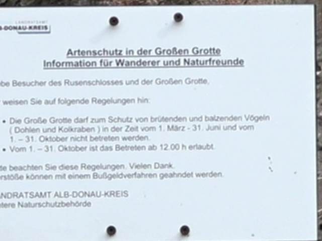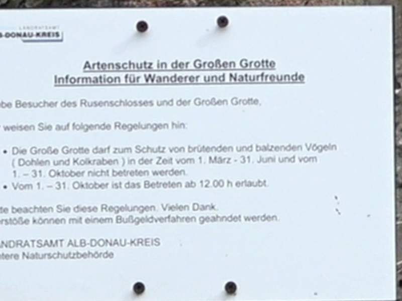 Die Große Grotte befindet sich unterhalb des Rusenschlosses, im Felsmassiv des Blautals. Die Große Grotte ist im Frühjahr und im Herbst wegen dort nistenden Vögel gesperrt. Funde zeigen, dass bereits vor ca. 50.000 Jahren mehrfach Neandertaler sich in der Höhle aufhielten. Der Ausblick über das umgebende Jagdgebiet war hervorragend. Es gab hier viel Wild, sodass eine bevorzugte Jagd möglich war. Die Große Grotte hat einen 17 m hohen und 15 m breiten, nach Westen gerichteten Eingang und ist 28 m tief. Adresse: Frauenbergstraße 45, 89143 Blaubeuren Webseite: https:// www. urmu. de/welterbe/fundstellen/grosse-grotte Geodaten: CR42+FH Blaubeuren