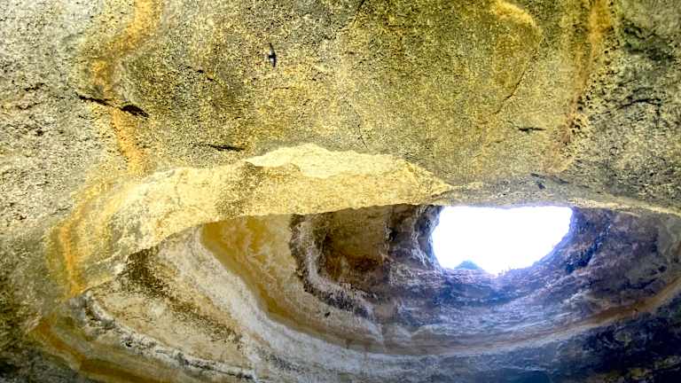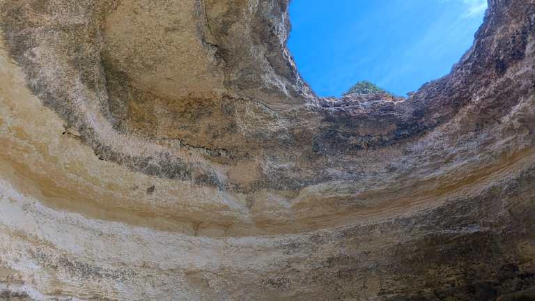 Die Höhle von Benagil wird oft als einer der Höhepunkte der Algarve bezeichnet. Wir sind bei unserer Steilküstenwanderung, die oben auf den Klippen entlang führte, bei der Höhle vorbei gekommen. Da die Decke der Höhle eingebrochen ist, hat man von oben einen guten Blick in die Höhle, der runter bis zum Wasser des Atlantiks geht. Zudem hat man von hier einen schönen Rundumblick, sei es auf die Steilküste, den Atlantik oder auf das Hinterland.