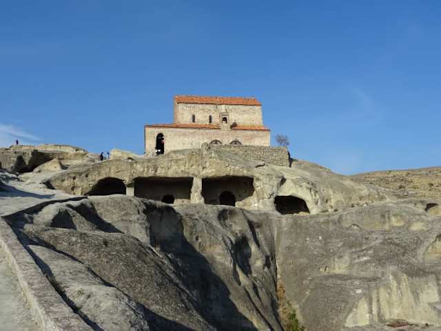 Dies ist der zweite einer Reihe von Reisetipps unserer 11tägigen Georgienreise, die wir zusammen mit georgischen Freunden im April 2016 unternommen haben. Für allgemeine Bemerkungen zum Reisen in Georgien sehen Sie den Tipp zum Felsenkloster Dawid Garedscha. Uplisziche (in engl. Transliteration: Uplistsikhe) ist eine antike Felsenstadt östlich von Gori, zwischen Tbilisi und Kutaissi. Gori selbst ist übrigens nicht sehenswert, es ist geradezu hässlich. Einzige zweifelhafte “Sehenswürdigkeit” ist das Museum, das einem auch heute noch in Gori verehrten „Sohn der Stadt“, Iosseb Bessarionis dse Dschughaschwili, bekannt unter dem Namen Josef Wissarionowitsch Stalin, gewidmet ist, einem der größten und grausamsten „Schlächter“ der Weltgeschichte. Die Hinweisschilder nach Uplisziche sind eher spärlich verteilt. Daher hier eine Wegbeschreibung: Man verlasse die Stalin Avenue nach Süden. Nach der Brücke über die Mtkvari (Kura) und einer Eisenbahnüberführung fahre man nach links am rechten Ufer der Mtkvari ostwärts. Etwa 5,6 km nach dieser Eisenbahnüberführung wende nach sich nach links in eine kleine Straße. Man überquere wieder die Eisenbahnlinie und den Fluss. Dann wird schon bald die Felsenstadt sichtbar. In Uplisziche haben sich Menschen schon in der Bronzezeit niedergelassen. Die Felsenstadt selbst wurde im 6. Jahrhunder v. Chr. gegründet und hat sich im 1. Jahrhundert n. Chr. zu einem Zentrum an der Seidenstraße entwickelt. Im 4. Jahrhundert schwand ihre Bedeutung mit der zunehmenden Bedeutung von Mzcheta (Mtskheta) und spater Tbilisi. Nach den Mongolenstürmen im 14. Jahrhundert wurde Uplisziche verlassen. Der größte Komplex der Felsenstadt ist der Palast bzw. die Halle der Königin Tamara (Tamaris Darbasi). Diese Halle ist eine Replik eines typischen georgischen Holzhauses, bei dem allerdings die „Holzbalken“ aus dem Sandstein gehauen wurden. Ferner gibt es eine antike Kirche, eine Apotheke, eine Bäckerei, ein Lagerhaus und einen Marktplatz. Zudem wurde später, im 9. bis 10. Jahrhundert, auf dem obersten Plateau eine kleine Basilika hinzugefügt, von der aus man einen wunderschönen Blick auf die sich windende Mtkvari hat. Leider war zu unserer Zeit die Basilika geschlossen. Uplisziche besaß übrigens ein ausgeklügeltes Wasserversorgungs- und Abwasserentsorgungssystem, das noch heute in den tiefen Felsenrinnen sichtbar wird. Empfehlenswert ist übrigens der Zugang durch den ehemaligen Wassertunnel, unmittelbar hinter der offiziellen Zugangstreppe. Man geht also den umgekehrten Weg. Man muss übrigens trittsicher sein, denn man ist zu mehr oder weniger anstrengender Kletterei gezwungen. Uplisziche/Uplistsike ist – zu Recht - auf der Vorschlagsliste für das UNESCO World Heritage-Programm. Für uns war es eines der Highlights der Reise.