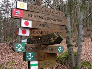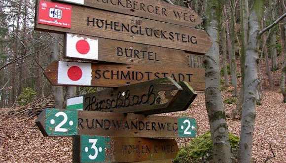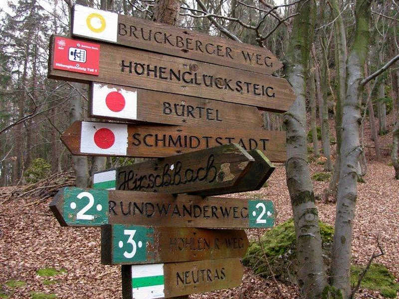 Der Höhenglücksteig gilt als der schönste Mittelgebirgs-Klettersteig. Er besteht aus 3 Teilen mit der Möglichkeit von Zwischenausstiegen. Direkt daneben befindet sich die "Via Ferrata Bambini", ein kurzer Übungsklettersteig für Einsteiger und Kinder. Tourenbeschreibung, Anreiseinfos usw. www.klettersteig.de/klettersteig/hohengluckssteig_hohenglucksteig_/12#Karte Parkmöglichkeit und Zustieg Parken kann man am Besten am Ortseingang von Hirschbach. Von hier aus benötigt man etwa 30 Min. für den Zustieg zum Beginn des Klettersteiges.