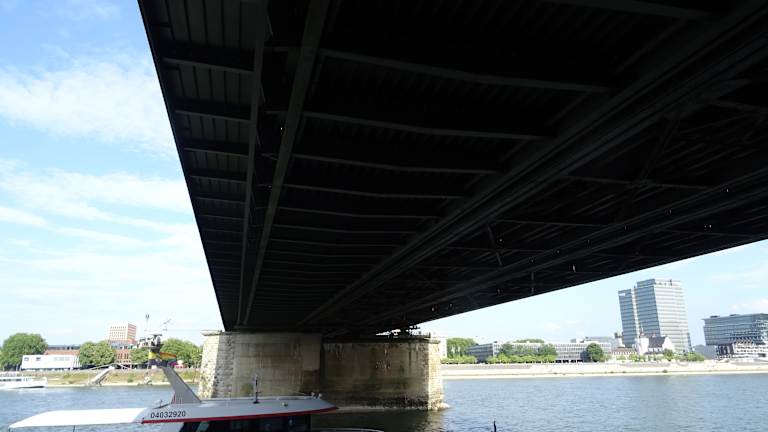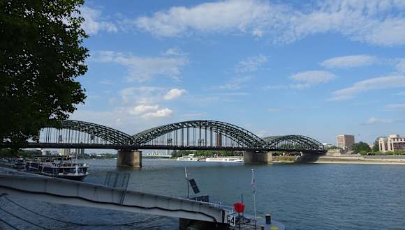 Die Fußgänger- und Eisenbahnbrücke ist ein fester Bestandteil des Stadtbildes von Köln. Mit 1220 Zugfahrten pro Tag ist sie die meistbefahrene Eisenbahnbrücke Deutschlands. Ein schöner Anblilck vom Rheinufer aus.