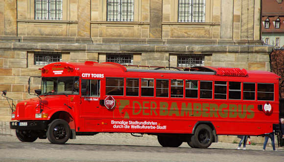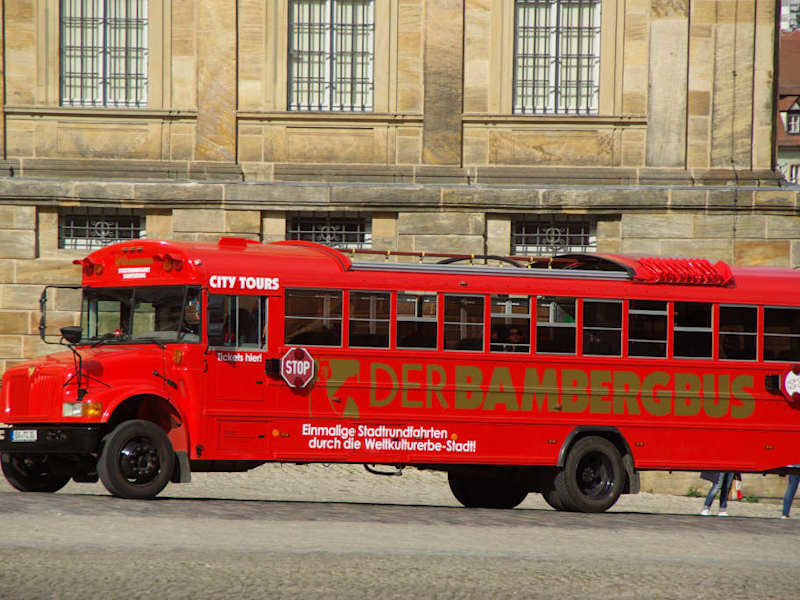 Wer sich nur für einen Tag in Bamberg aufhält, wird es wohl kaum schaffen, zu Fuß die wichtigsten Sehenswürdigkeiten der Stadt zu erkunden. Abhilfe schafft da der „Bambergbus“ – ein umgebauter amerikanischer Schulbus, der früher in Maryland Kinder zur Schule brachte und inzwischen in knalligem Rot im Stundentakt durch die Innenstadt rollt. Mit seinen 24 Sitzplätzen und einer erläuternden Reiseleitung fährt der „Bambergbus“ seine Runden ab dem Hauptbahnhof und hält an weiteren 14 Stationen. Im Sinne eines „Hop on - Hop off“ kann man beliebig oft aus- und nach einer Stunde wieder zusteigen, um die Stadtrundfahrt mit der nächsten Runde fortzusetzen. An der Strecke liegen unter anderem die historische Altstadt mit Kranen, Konzerthalle, Rathaus und Stadtarchiv, der Domplatz mit dem Bamberger Reiter, sowie der Hainpark mit seinem Botanischen Garten. Von den Haltestellen ist es just einen Katzensprung weit entfernt bis zu weiteren Highlights der Stadt, etwa dem Michaelsberg oder dem malerischen „Klein Venedig“ – ganz nach Gusto. Der „Bambergbus“ startet ab Anfang März bis Ende Oktober täglich ab 10.00 Uhr zu seiner Runde vom Hauptbahnhof (direkt am ZOB vor dem Haupteingang zur vollen Stunde) und beendet die Tour um 17.00 Uhr. Tickets kauft man direkt im Bus und für 9,50 Euro (Stand 2017) rollt man bequem von Highlight zu Highlight durch das „Juwel an der Regnitz“.