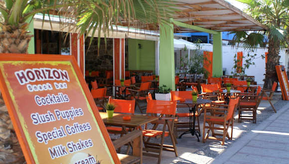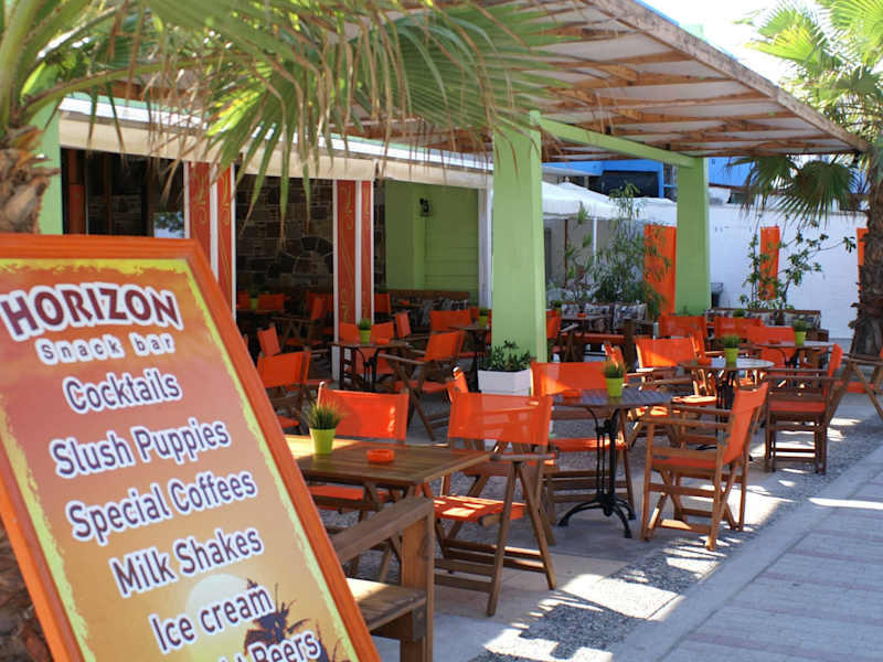 Die Horizon Bar befindet sich direkt an der kleinen Strandpromenade von Mastichari. Beidseitig einrahmt von Tavernen hat man von dort, durch die alten Tamarisken die das Bild abrunden, einen schönen Blick auf Strand und Meer. Abends kann man hier auch malerische Sonnenuntergänge genießen. Bar und Terrasse sind gemütlich eingerichtet, machen immer einen sehr sauberen, aufgeräumten Eindruck. Der Service ist aufmerksam und freundlich, die Mitarbeiter haben immer ein lächeln parat und von Sprachbarrieren ist hier kaum etwas zu merken. Die Musik im Hintergrund ist dezent. Die Toiletten waren immer sauber. Die Bar bietet neben den üblichen Getränken eine große Auswahl an Cocktails und Snacks an. Die Cocktails zu 6,00 Euro sind schmackhaft und ansprechend dekoriert. Auf der Karte sind Snacks in verschiedenen Variationen wie Salat, Toast, Baguette, Bruschetta und Hamburger zu finden. Die Preise liegen bei ca. 2,50 bis 5,00 Euro und sind, auch für den kleineren Geldbeutel, sehr erfreulich. Geschmacklich war alles gut und mehr als nur ausreichend um den Hunger auf eine Zwischenmahlzeit zu stillen. Wer typisch griechische Gerichte und Fisch sucht, ist hier allerdings falsch. Die Horizon Bar öffnet bereits ab 9.00 Uhr um den Tag möglicherweise mit einem Cappuccino zu beginnen. Die Atmosphäre ist, je nach Tageszeit, zwischen ruhig und quirlig. Ich kann den Besuch der Horizon Bar absolut empfehlen.