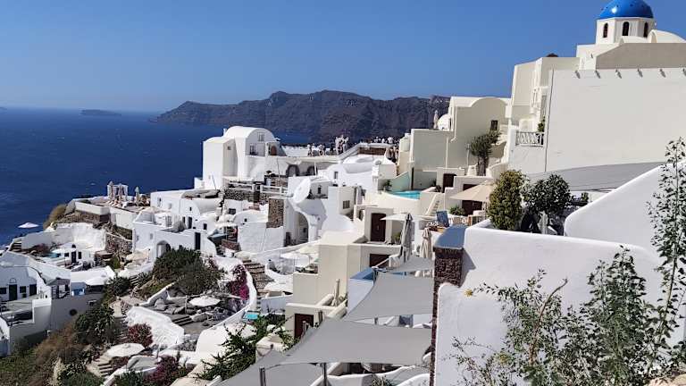 Eine traumhafte Archithekturkulisse mit mega Ausblick auf die Ägäis. Trotz vieler Menschen aus aller Welt ist ein Besuch das Highlight eines Griechenlandurlaubes. Gebäude in traumhaften weiss, dazu eine exklusive Atmosphäre und einmalige Fotos für die Ewigkeit machen.