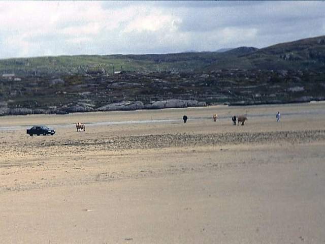 Bei der Besichtigung der Kirche von Claddagduff vermissten wir den Friedhof. Der am Morgen schon angetrunkene katholische Pfarrer teile uns mit, daß dieser auf der gegenüberliegenden Insel zu finden sei. Über die Gezeiten konnte er uns nicht informieren, da er erst seit 14 Tagen in der Gegend wohne! Lagebeschreibung: Die Kirche von Claddagduff und der Friedhof von Omey Island in Connemara. Hinweis/Insider-Tipp: Wir wagten den Weg zur Insel und kamen trockenen Fußes wieder zurück. Unterwegs begegnete uns eine Gruppe von Kühen, die wohl ebenfalls dem Friedhof einen Besuch abstatten wollten.