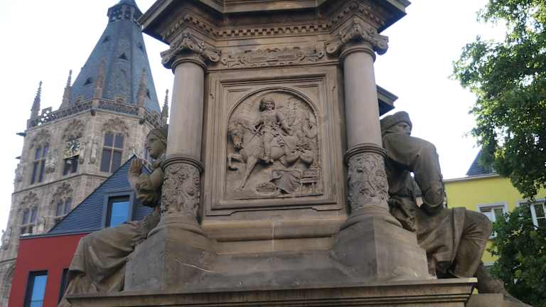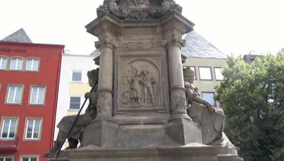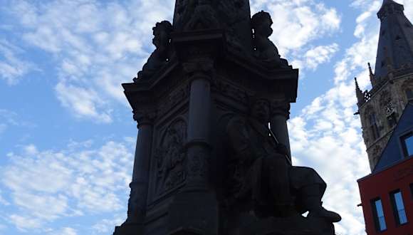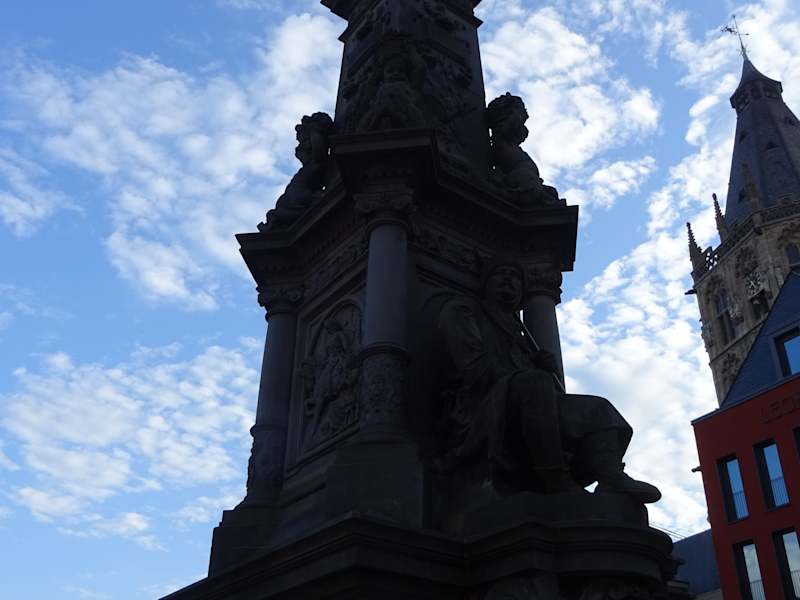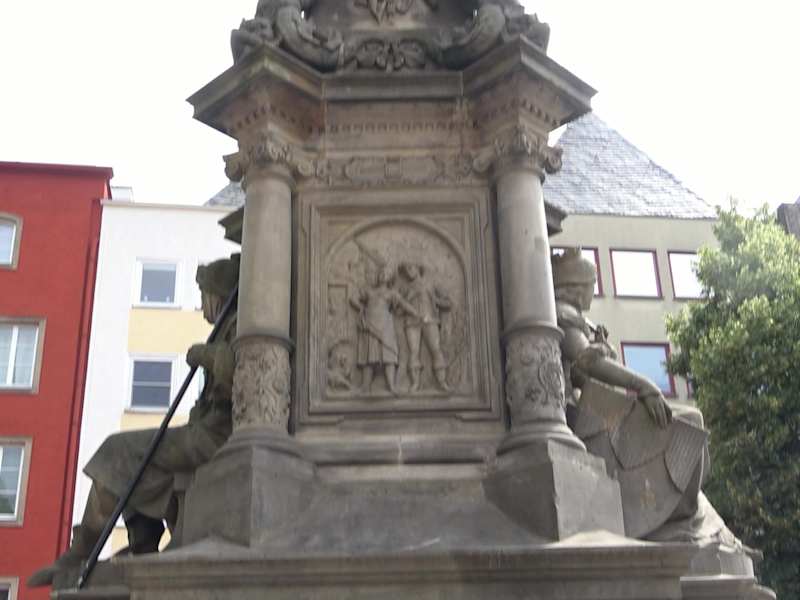Eine besondere Sehenswürdigkeit am Alter Markt ist der Jan-von-Werth-Brunnen. Der Brunnen erinnert an das Märchen von Jan und Griet. Diese Kölner Liebesgeschichte wurde von Carl Cramer geschrieben. Zu seinen Ehren steht am Alter Markt der Jan-von-Werth-Brunnen. Die Liebesgeschichte begann am Kümpchenhof. Knecht Jan arbeitete auf dem Kümpchenhof. Jan war sehr ehrgeizig. Er wollte mal ein wohlhabender Bauer werden. Er war verliebt in die schönste Magd vom Kümpchenshof. Die Magd hieß Griet. Er wollte ihr seine Liebe gestehen. Die Magd Griet war aber nicht begeistert von seinem Antrag. Sie wusste, von ihrer Schönheit und wollte sich nicht mit Jan zufrieden geben. Sie wollte einen reicheren Mann als Ehemann. Vor lauter Kummer fasste Jan den Entschluss, den Kümpchenhof zu verlassen. Er zog dann in den damaligen 30-jährigen Krieg. Er war 30 Jahre fort und kämpfte in ganz Europa. Jan machte Karriere im Krieg und wurde sogar Reitergeneral. Die Kölner waren sehr stolz auf ihren Jan. Griet hingegen war dagegen nicht sehr erfolgreich. Ihre Schönheit verschwand mit der Zeit und keiner wollte sie mehr. Sie hatte den Kümpchenshof verlassen und verkaufte Gemüse am Severinstor. Reitergeneral Jan wurde nach Kriegsende stolz in der Stadt Köln empfangen und alle feierten ihn. Als der Kriegsheld Jan am Severinstor vorbei kam, blieb er auf einmal stehen. Er erkannte Griet sofort wieder, die auf dem kleinen Markt ihr Gemüse verkaufte. Griet bedauerte sehr, dass sie Jan damals nicht geheiratet hatte. Aber wer weiß, hätte sie ihn geheiratet, dann wäre Jan vermutlich gar nicht in den Krieg gezogen. Dann wäre er bestimmt kein Reitergeneral geworden. Der Jan-von-Werth-Brunnen wurde 1884 vom Verschönerungsverein 1884 gestiftet und von Wilhelm Albermann auf dem Alter Markt erbaut. Über der Brunnenanlage befindet sich die Standfigur des Jan von Werth, der breitbeinig mit Reiterstiefeln und Rock dargestellt wird und sich mit beiden Armen auf ein Schwert stützt. Auch sind zwei überlebensgroße, sitzende Figuren am Brunnen dargestellt. Die männliche Figur verkörpert einen Kölner Bauern, erkennbar durch einen Stock in der rechten Hand und die weibliche Figur, mit einem Schild in der rechten Hand, steht für die Kölner Jungfrau. An den Seiten des Brunnen sieht man Szenen aus der Legende: Den traurigen Jan, von Griet verschmäht, und Griet die Jan ihre Hand zum Gruß entgegenstreckt, als er als hochdekorierter Reitergeneral nach Köln zurückkommt. Jan von Werth (1591 – 1652) war einer der bekanntesten deutschen Reitergeneräle im Dreißigjährigen Krieg. Er war General auch bei der Schlacht bei Dachau am 5.10.1648 beteiligt. Es war die letzte größere militärische Konfrontation des Dreißigjährigen Krieges. Diese Information war für mich sehr interessant. Ich habe ein Familienwappen auf dem zu lesen ist, dass mein Ururgroßvater Jakob als Klempnermeister im Jahr 1491 in Cöln am Rhein lebte. Nach dem 30 jährigen Krieg (vermutlich 1648) kam dann der nächste Ururgroßvater nach Süddeutschland (München) . Er soll laut Auskunft von meinem schon verstorbenen Großonkel, als Soldat im 30 jährige Krieg gedient haben. Es könnte sein, dass mein Ururgroßvater damals als Cölner bei der Einheit von Jan von Werth, als Soldat diente. Der Brunnen hat mir sehr gut gefallen. Vielleicht ist Jan von Werth verantwortlich für meinen Lebensweg als Bayer.