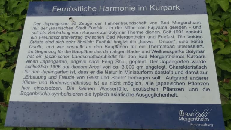 Wenn man vom Deutschordensschloss kommend die Tauber über die Brücke zum Kurparkt überquert, so kommt man nach weiteren ca. 600 – 700 Metern, quer durch den Kurpark, zum östlichen Ausgang / Eingang vom Kurpark beim Erlenbachweg. Hier befindet sich, gegenüber vom östlichen Ausgangs-/ Eingangspavillon vom Kurpark, der nach Feng Shui Richtlinien angelegte Japanische Garten, der 1996 eröffnet wurde. Er ist ein Symbol für die „Fahnenfreundschaft“ zwischen Bad Mergentheim und der japanischen Kurstadt Isawa (welche seit 2004 ein Teil der Stadt Fuefuki ist). Diese „Fahnenfreundschaft“ existiert seit 1991. Im Japanischen Garten findet man einen Felsgarten, kleine Wasserfälle, Wasserläufe, einer kleinen Steinbrücke, Springbrunnen, exotische Pflanzen und Bäume, kleine Steinlaternen usw. Der Japanische Garten wird von schönen Wegen durchzogen und uns hat unser Spaziergang durch diesen kleinen Park sehr gut gefallen.