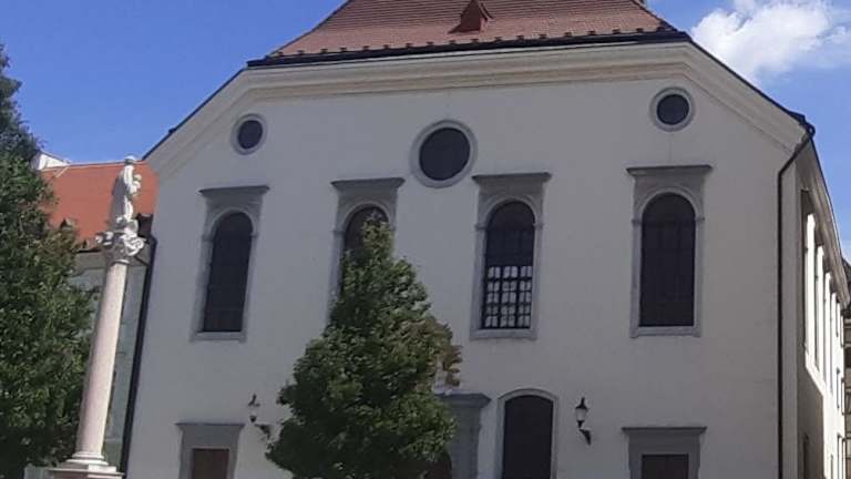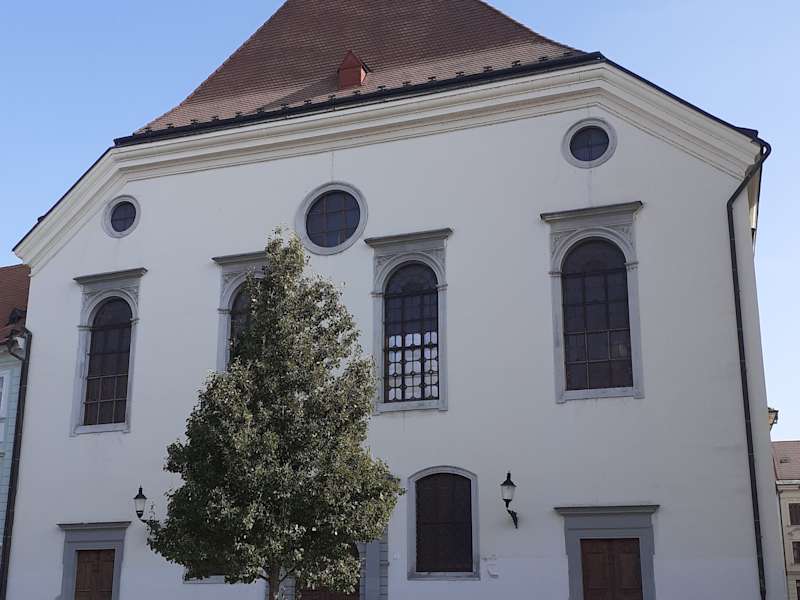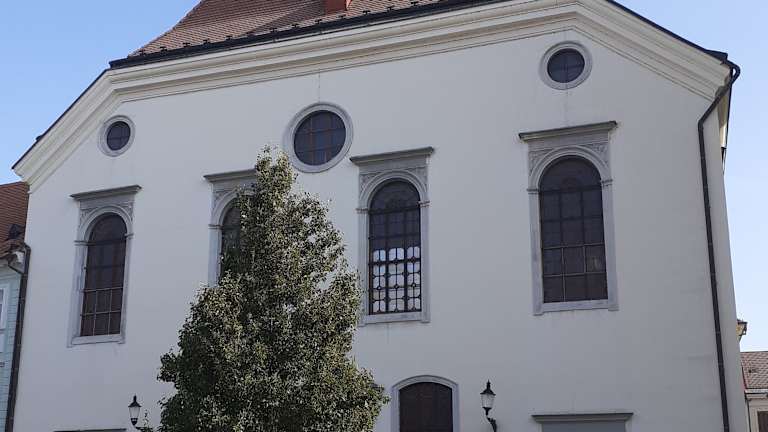 Die Kirche des Jesuitenordens befindet sich am Hauptplatz der Stadt direkt neben dem historischen Rathaus. Wegen dieser Lage gab es beim Bau zwischen 1636 und 1638 strenge Auflagen. So durfte das Gebäude nicht das Aussehen eines Sakralbaus haben, und der Bau eines Turms war untersagt. Dadurch kam es, dass ein schlichtes Gebäude im Stil der Spät-Renaissance entworfen wurde, und die römisch-katholische Kirche eher das Aussehen eines evangelischen Bethauses erhielt. Der Turm, den man neben der Kirche sieht, gehört zum Rathaus, nicht zur Kirche. Die Kirche der Jesuiten steht nur wenige Schritte entfernt von der Kirche der Franziskaner. Der Gegensatz der beiden Kirchen ist bemerkenswert. Während die Jesuitenkirche eher schmucklos ist, ist die mehrere Hundert Jahre ältere Kirche der Franziskaner recht prunkvoll ausgestattet.