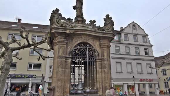In der Heimat von Markgräfin Sibylla Augusta wurde der Heilige Nepomuk als Patron des Beichtgeheimnisses, der Schiffer und Flößer und der Sterbenden verehrt. An der Stelle des Johannes Nepomuk Brunnen stand schon zuvor ein Ziehbrunnen. Das schöne schmiedeeiserne Gitter wurde erst nach einer Renovierung des Brunnens im 19. Jahrhundert angebracht.