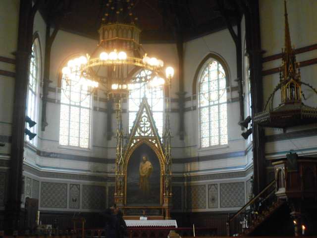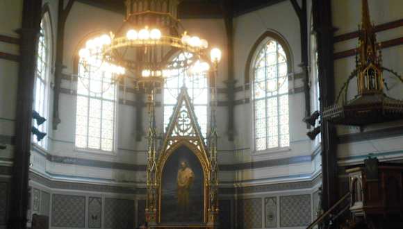 Die rote Backsteinkirche auf einem Hügel im Stadtteil Sydnes ist schon von weitem sichtbar und es lohnt sich, die Mühe des Aufstiegs über die vielen Treppen auf sich zu nehmen. Dem imposanten Äußeren mit seiner Architektur aus dem späten 19. Jahrhundert folgt beim Betreten der Kirche ein eher schlichtes Inneres mit einem besonders schönen Altarbild. Darüber hinaus hat man von dort oben einen schönen Blick über Bergen.