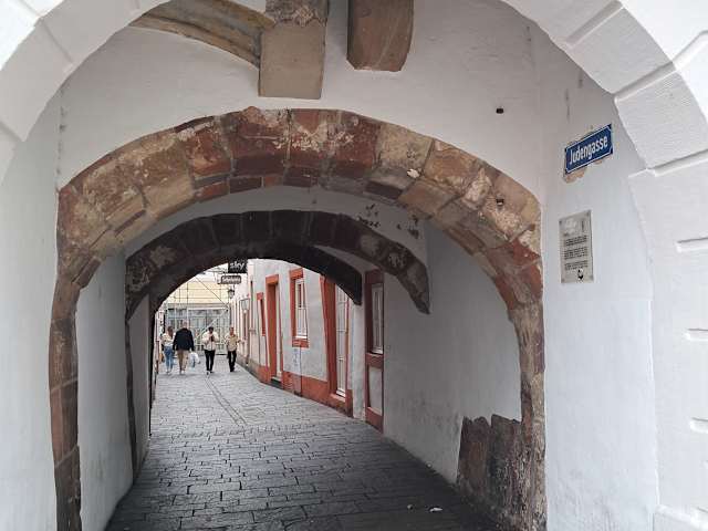 Direkt am Markt kann man heute noch den Durchgang zum ehemaligen Judenviertel sehen, allerdings wurden die Juden aus Trier schon 1418 vertrieben, jetzt ist in diesem Viertel eine Gastroszene entstanden. Vom Hauptmarkt kann man diese Pforte leicht finden, zwischen Fachwerkhäusern.