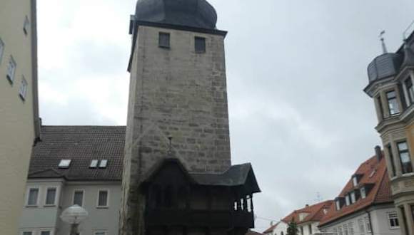 Eines der mittelalterlichen Türme und Stadteingange von Coburg ist der Judenturm. Durch ihn gelangte man von der Judengasse die in die sog. Judenvorstadt aus dem 13. Jahrhundert und heute direkt auf den Markplatz. Die Judenvorstadt war ein Viertel mit eigener Schule und Synagoge. Der Turm gehörte zum inneren Befestigungsring und hat eine spitzbogige Durchfahrt. Judengasse 96450 Coburg