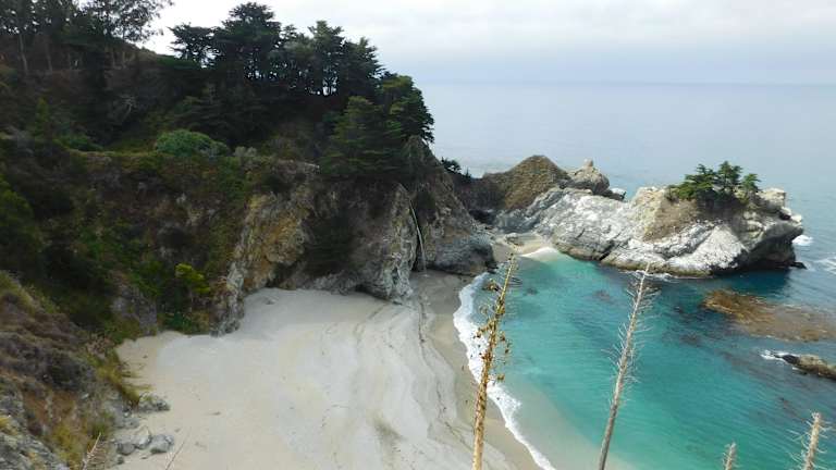 Hier muss man einfach hin! Dies ist der vielleicht größte Hot Spot und der berühmteste Ausblick am Big Sur: Der McWay Wasserfall. Wir haben es wie fast alle Toursiten gemacht: Anhalten, aussteigen und den kurzen Fußweg zum Wasserfall (Eigentlich ein "Wasserfällchen") hinunter gehen und wie verrückt fotografieren. Es gibt aber auch natürlich die Möglichkeit gut ausgeschilderte Wanderpfade in die Berge zu erklimmen. Hier herrscht Natur pur, vor!