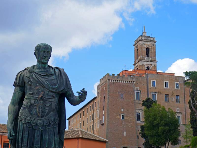 Wer das Glück hat vom Colosseum über die Straße Via dei Fori Imperiali zu gehen, kann auf der linken Seite das Denkmal vom bekanntesten römischen Feldherrn sehen. Das Denkmal steht etwas versetzt, eigentlich aber vor dem Foro Cesare, welches nicht auf der Straße liegt, sondern unterhalb des Zauns im Forum Romanum. Da unten in der Nähe gibt es neue Ausgrabungen von Mosaiken, die auch schön sind.
