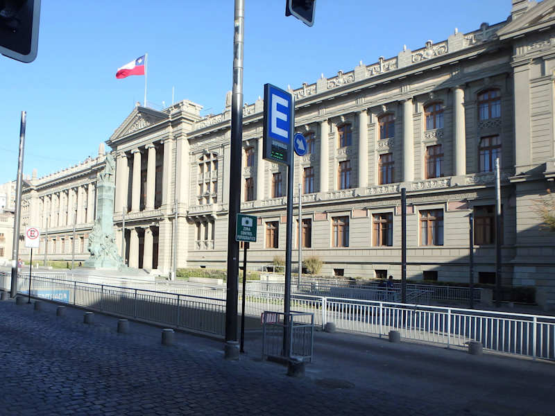 Der "Palacio de Tribunales de Justicia" liegt an der Calle Compañía, zwischen den Calles Morandé und Bandera. Das Gebäude beherbergt den obersten Gerichtshof, das Berufungsgericht und das Militärgericht der chilenischen Armee. Das Bauwerk wurde zwischen 1905 und 1930 nach den Plänen des französischen Architekten Emilio Doyére im neoklassizistischen Stil errichtet. Das Portal zeigt im Erdgeschoss dorische und im Obergeschoss ionische Säulen. Die Haupttreppe ist aus Marmor und mit zwei Karyatiden des spanischen Bildhauers Antonio Coll dekoriert. Seit 2002 ist das Justizgebäude für die Öffentlichkeit zugänglich. Im Jahr 1976 wurde es von der chilenischen Regierung zur National Historic Landmark erklärt.