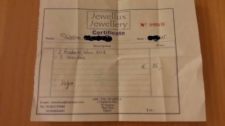 Hallo zusammen , Meine Partnerin und ich waren in Dezember über Weihnachten in El Gouna. Auf der Suche nach einem kleinen Mitbringsel nach Deutschland in Form von Goldschmuck kamen wir an dem Laden jewellux am Hafen nicht vorbei. Wir kauften jeweils ein armkettchen sowie fuer mich als Mann eine gedrehte Gelbgoldkette insgesamt fuer mehrere hundert Euro. Nach nicht einmal einer Woche - leider wieder zurück in Deutschland fiel das Kettchen meiner Frau einfach vom Arm und bei mir riss eine Kordel der Kette auf . Trotz mehrmaliger kontaktversuche auch über die E-Mail ( mit Foto vom Beleg ) etc werden wir bewähr ignoriert. Ein sehr schlechter Service von diesem Juwelier. Mangelware und schlecht , nicht zu empfehlen.