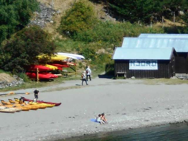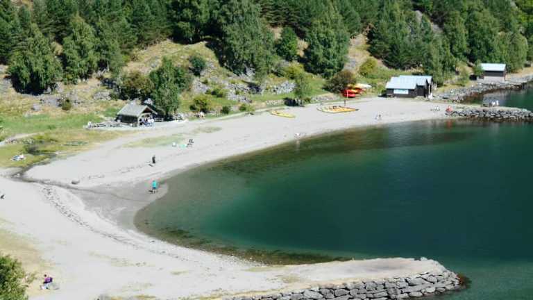 Neben der Mündung des Flusses Flåmselvi in den Aurlandsfjord gibt es eine schöne kleine Badebucht. Hier am Strand kann man auch Kajaks für einen Ausflug auf dem Fjord mieten.