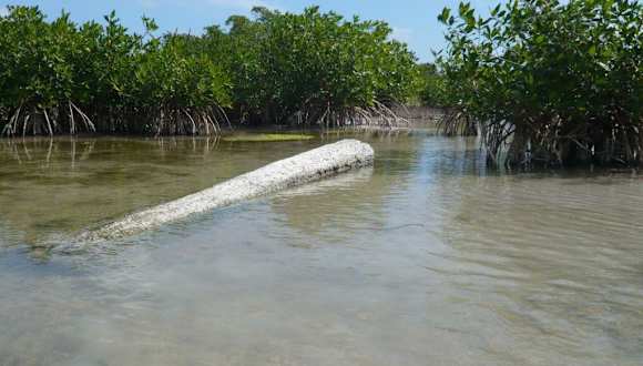 Nördlich von Xcalak führt eine Straße zu den Resorts über eine Brücke. Mit dem Kajak kann man unter dieser hindurchfahren und man kommt in die Lagune von Xcalak. Die Fahrt geht durch einen schmalen Kanal - fast einen Tunnel - aus Mangroven. Man kann auf der Fahrt knallrote Krebse und bunte Vögel beobachten. Unter der Brücke wohnt in einer kleinen Höhle auch ein Leguan. In der Lagune, die vollständig von Mangroven umsäumt ist, ist es sehr friedlich und still. Man hört nichts bis auf das Kreischen der Vögel und das Surren der Insekten. Insekten gibt es sehr viele dort, deshalb sollte man sich auch vor ihnen schützen.