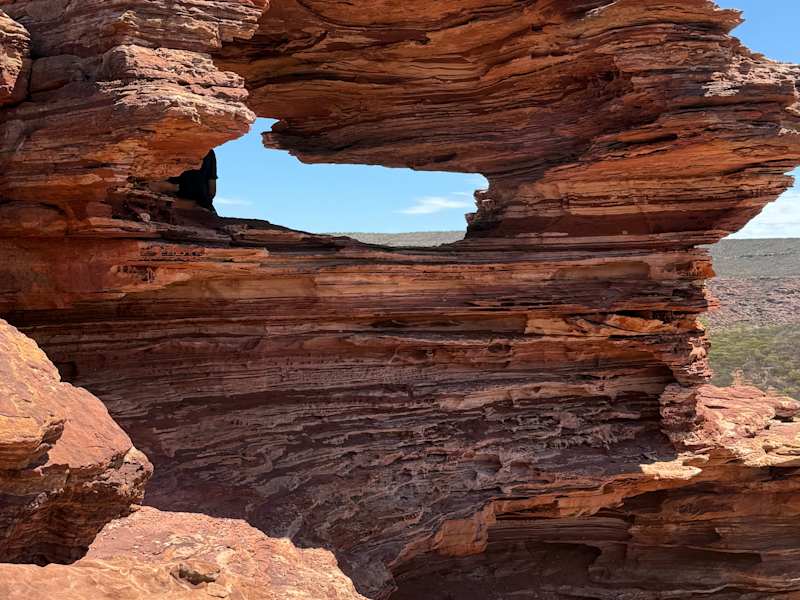 Dieser schöne Park liegt etwa 550 Kilometer nördlich von Perth. Hört sich nicht so weit an, die Fahrt zog sich aber länger als gedacht. Die Straßen sind zwar gut ausgebaut, aber eben keine Autobahn, so dass es immer wieder auch kurvige Strecken gab. Vom Ort Kalbarri liegt der Parkeingang noch etwa 15 Kilometer entfernt. Der Eintritt beträgt , wie üblich in Westaustralien, 11 Dollar pro Auto und ist am Eingang zu entrichten. Ab hier geht's dann auf einer nicht asphaltierten, sandigen Piste zu den jeweiligen Aussichtspunkten. Auch ohne Allradfahrzeug ist diese gut zu befahren; zumindest außerhalb der Regenzeit. Auch hier sind die Entfernungen nicht zu unterschätzen. Man fahrt z.B. ca. 35 Kilometer bis Nature's Windows bzw. bis zum Aussichtspunkt Z'Bend. Aus Rücksicht auf die Tierwelt sollte man langsam fahren; wenige Meter vor uns hüpfte ein Kangaroo über den Weg. Ich besuchte den Park Ende Oktober und war erstaunt, wie viele Büsche noch blühten. Die verschiedenen Aussichtspunkte sind gut beschildert und an einigen gibt es kürzere oder auch längere Wanderwege und sogar Toiletten. Man sollte tatsächlich viel zu Trinken mitnehmen, denn hier ist es einige Grad wärmer als an der Küste. Leider waren Ende Oktober Tausende von Fliegen geschlüpft, die einen umschwirrten, sobald man das Auto verließ. Dagegen hilft am Besten ein Fliegennetz, was man über den Kopf zieht. ein weiterer schöner Teil des Parks erstreckt sich über einige Kilometer an der Küste südlich des Ortes Kalbarri. Auch dort führen mehrere beschilderte Abzweige zu sehr lohnenswerten Aussichtspunkten an denen es außergewöhnliche Felsformationen zu bewundern gibt. An einigen Parkplätzen gibt es auch Wege hinunter zum Meer, wo man zu kleinen Strandbuchen wandern kann