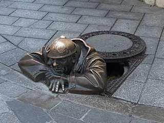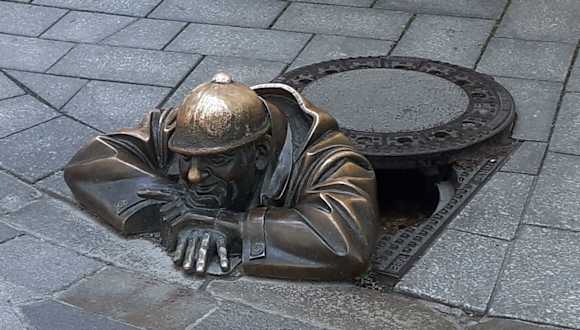 Es gibt wohl keine geführte Tour durch Bratislava, bei der die Fremdenführer die Besucher nicht an dieser Bronzefigur vorbeiführen, die in der Fußgängerzone „aus einem Kanaldeckel guckt“. Ich bin dabei nicht ganz sicher, ob es sich hier um eine Sehenswürdigkeit oder um eine Kuriosität handelt. Na ja, wenn man vorbeikommt, ist der Kerl ein Foto wert.
