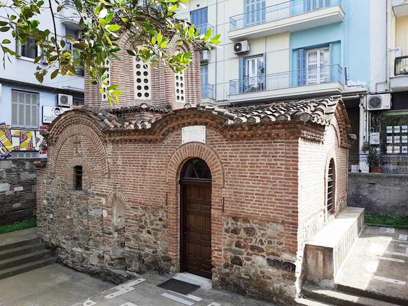 Direkt an der Egnatia, aber deutlich unter dem heutigen Straßenniveau, so dass nur wenig mehr als das Dach herausragt, steht diese kleine Kirche aus dem 14. Jahrhundert. Das nach der hier angebrachten Informationstafel als Begräbniskirche zwischen 1345 und 1350 erbaute Gotteshaus wirkt etwas verloren zwischen den großen Wohnbauten in der Nachbarschaft. Während der Instandsetzung nach dem Erdbeben von 1978 wurden Fresken freigelegt, die aus der Zeit der Gründung der Kirche stammen.