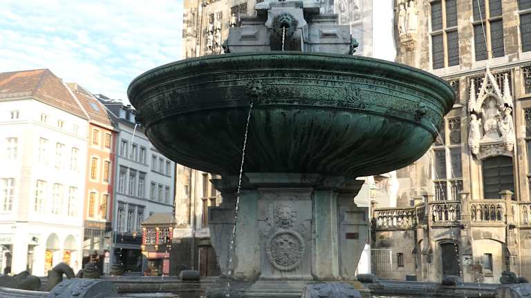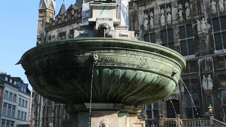 Auf dem Aachener Marktplatz steht der älteste Brunnen der Kaiserstadt, der bereits 1620 mit der namensgebenden Bronze-Figur Karl des Großen versehen wurde. In der Mitte des ausladenden Brunnenbeckens, in dem sich zwei wasserspeiende Bronze-Fische befinden, ragt eine zentrale Steinsäule empor, die als Fundament der sechs Tonnen schweren Brunnenschale dient. Im Aachener Dialekt wird diese gerne etwas despektierlich als „Eäzekömpche“ bezeichnet – auf hochdeutsch etwa „Erbsenschüsselchen“. Zentrales Element des Karlsbrunnens ist natürlich die Statue des Kaisers, der in seiner Rüstung mit Reichsapfel, Zepter und Krone wahrlich beeindruckt. Während der „Franzosenzeit“ wurde 1792 die Statue des Kaisers demontiert und als Kriegsbeute nach Paris verbracht – erst 1804 kam sie wieder zurück und krönte im Jahr darauf erneut den Karlsbrunnen. Die nächste „Demontage“ erfolgte während des II. Weltkrieges, den der Karlsbrunnen somit unbeschadet überstand. Die heutige Brunnenfigur von Kaiser Karl dem Großen ist übrigens lediglich eine Kopie – das Original befindet sich seit 1969 im Krönungssaal des Rathauses.