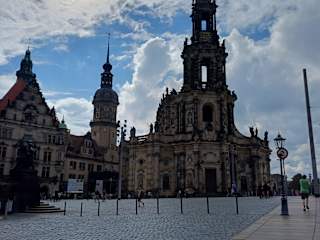 Die katholische Hofkirche wurde ursprünglich zwischen 1739 bis 1755 erbaut (Dresden war damals eine evangelische Stadt). Die Hofkirche befindet sich auf dem Schlossplatz, gleich neben dem Residenzschloss und ist mit diesem seit 1899 mit einem Steg / Brücke (der Seufzerbrücke) verbunden. Im Zweiten Weltkrieg wurde auch die Hofkirche in der Nacht vom 13.02.1945 schwer beschädigt und teilweise zerstört. Nach dem Krieg wurde sie wieder aufgebaut und konnte im Jahr 1965 fertiggestellt werden. Der Wiederaufbau ist gut gelungen und bei der Ansicht der Hofkirche bemerkt man nicht unbedingt gleich, dass die Kirche mehr oder weniger neu erbaut wurde. Von außen ist die Hofkirche nach meiner Meinung von allen Seiten sehenswert (sei es vom Schlossplatz, von der Brühlschen Terrasse, von der Augustusbrücke vom Theaterplatz oder vom Residenzschloss / Hausmannsturm aus) und immer das eine oder andere Bild wert (besonders am Abend, wenn alles in warmem Licht gehüllt ist). Aber auch eine Innenbesichtigung ist nach meiner Meinung unbedingt anzuraten. Für mich war die Orgelmusik in der Hofkirche ein besonderes High-Light (es wird auf der Silbermann-Orgel gespielt). Diese Orgelmusik findet jeweils am Mittwoch und Samstag zwischen 11:30 und 12:00 statt und diese Konzerte sind kostenlos (man sollte jedoch eine Spende abgeben).