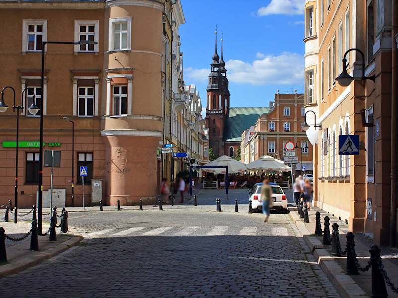 Die gotische Kathedrale zum Heiligen Kreuz die größte Kirche der Stadt. 1934 wurde sie offiziell zur Basilica minor (vom Papst verliehener Ehrentitel) erhoben. Seit 1972 ist sie die Kathedrale der Diözese in Opole. Die Geschichte der Domkirche zum Heiligen Kreuz reicht bis zur Errichtung einer ersten Holzkirche im Jahr 1002 zurück. Ihr heutiges Gesicht erhielt sie erst mit der Fertigstellung der beiden Türme (1899-1900). Schon von weitem sind die fast 73 Meter hohen Türme im neugotischen Stil zu erkennen.