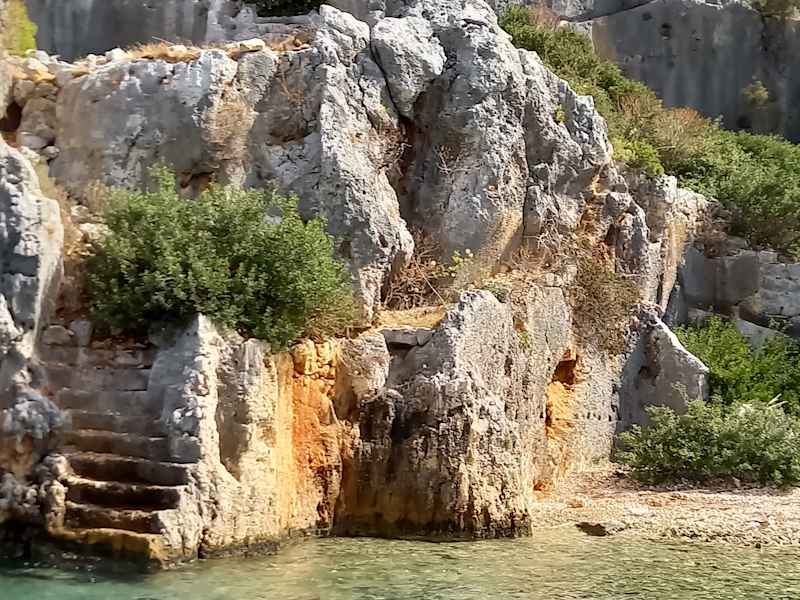Eine klasse Über- und Unterwasserlandschaft ist das Gebiet, das nach der Insel als Kekova bezeichnet wird. Hier liegt die legendäre versunkene Stadt. Man sieht vom Schiff am Ufer viele Hausreste und in den Fels gehauene Treppenstufen.