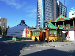 Die große Filzjurte in der Seoul Street fällt zwischen den Hochhäusern sofort auf – außerdem steht hier auch noch das historische Wohnhaus und ein Denkmal von C.W.M. Khanddorj, einem bedeuten mongolischen Staatsmann.