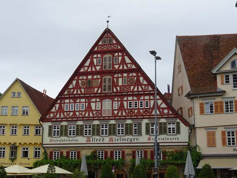 Auf dem Marktplatz Nr.3 steht dieses Kielmeyerhaus . Es wurde auf den Kellerräumen bzw. dem Kelteruntergeschoß des vorher dort befindlichen Kellerreispitals aufgebaut. Das Kellereispital gehörte zum Katharinenspital welches abgerissen wurde. Gewölbe waren immer sehr begehrt, denn es gab damals noch keine Keller die den Wein bessser kühl hielten. Seit dem 18. Jh ist das Haus im Besitz der Familie Kielmeyer, die es zum Wohn- und Geschäftsbau nutzten. Auf dem Marktplatz ist es das beherrschende Gebäude und es gehört mit dem Alten Rathaus zu den beiden meist fotografierten Gebäuden. An der Seite des Hauses soll sich eine kleine Nische befinden, in welchem ein Schwarzes Männle steht. Die Sage ist folgende: Das Schwarze Männle soll jede Person verdroschen haben, welche sich im Keller etwas angeeignet habe. Leider war diese Hausseite beim Weihnachtsmarkt völlig zugestellt, sodaß wir es nicht sehen konnten, das wird sich bestimmt ändern.