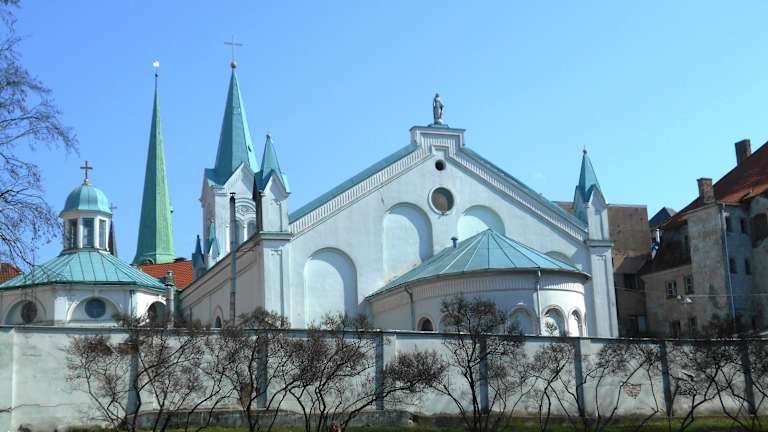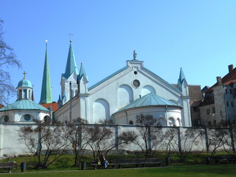 Die Kirche der Schmerzhaften Maria (Sāpju Dievmātes baznīca) wurde 1785 im pseudoromanischen Stil erbaut. Es war die erste katholische Kirche, die nach dem Einzug der Reformation in Lettland gebaut wurde. Vorausgegangen war die im Jahr 1710 von der Regierung des Russischen Reiches den Katholiken gewährte Religionsfreiheit und 1780 ein Besuch des Kaisers des Heiligen Römischen Reiches, Josef II., der sich bei der Zarin Katharina II. für den Bau der Kirche einsetzte, die dann zum Teil aus Spenden des Kaisers und seiner Mutter Maria Teresa finanziert wurde. 1885 wurde die Kirche um ein achteckiges Baptisterium erweitert. Die weiß leuchtende Kirche ist ein Blickfang direkt neben dem Rigaer Schloss am Ufer der Daugava.