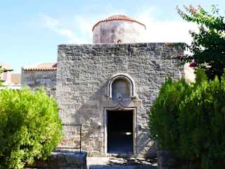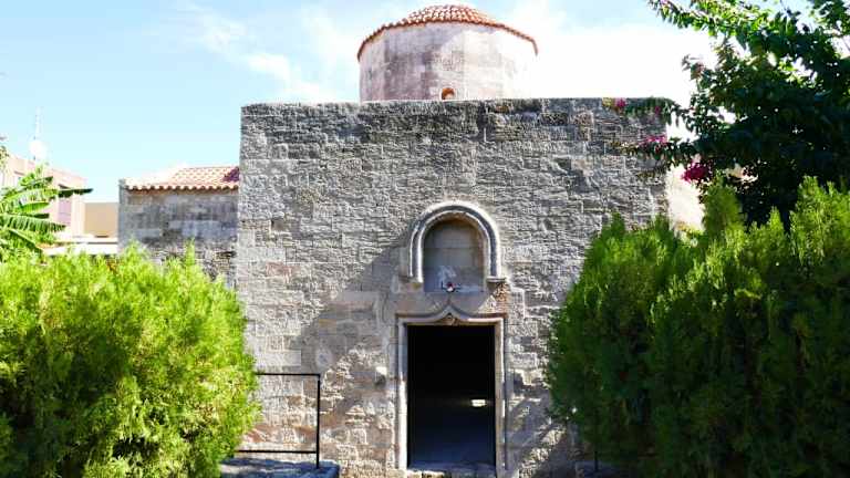 In der Straße Ippodamou liegt diese kleine schön erhaltene Kirche. Bei unserem Besuch hatten wir den Eindruck, daß die Kirche auch schon einmal als Moschee diente, jetzt aber als Museum dargestellt war. In ihr konnte man sehr gute Fresken bestaunen, auch von der Insel Kos, die jedoch auf einer Leinwand gemalt waren. Hinter der Kirche gibt es einen netten Garten. Wir konnten die Kirche nur mit dem Ausweis betreten, daß wir eine doppelte Impfung hatten.