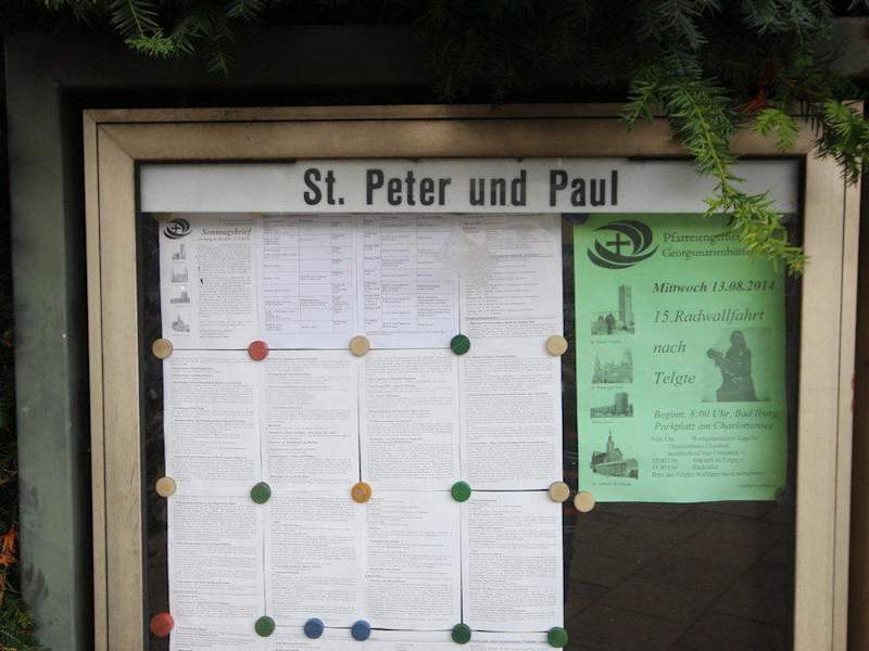 Kath. Kirche St. Peter und Paul Pfarreien-Gemeinschaft Georgsmarienhütte Ost Oeseder Straße 68 D-49124 Georgsmarienhütte Pfarrbüro St. Peter und Paul Auf dem Thie 7 D-49124 Georgsmarienhütte Telefon: +49 5401 86420 Telefax: +49 5401 864224 E-Mail: pp@pggo.de Internet: http://pggo.de Koordinaten:52° 12′ 24″ N, 8° 3′ 52″ O