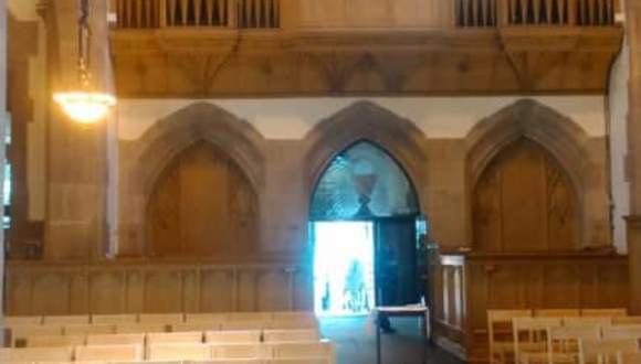 Eine Kirche in der Holz dominiert.