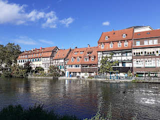 Im Zentrum von Bamberg, am rechten Ufer vom linken Arm der Regnitz gelegen, befindet sich die alte Fischersiedlung von Bamberg, die heute Klein-Venedig genannt wird. Zwischen den kleinen, ehemaligen Fischerhäusern und der Regnitz befinden sich kleine Gärten oder Veranden / Terrassen. Sehr schön ist der Blick auf Klein-Venedig von der Regnitz aus, bzw. von der Unteren Brücke, vom linken Ufer der Regnitz und von der Markusbrücke aus. Hingegen hat mir der Spaziergang durch Klein-Venedig nicht besonders gefallen. Aber man sollte sich Klein-Venedig mit seinen kleinen Häusern vom gegenüberliegenden Ufer und / oder von der Unteren Brücke bzw. von der Markusbrücke aus unbedingt einmal anschauen, da Klein-Venedig von hier wirklich schön aussieht und das eine oder andere Foto wert ist.