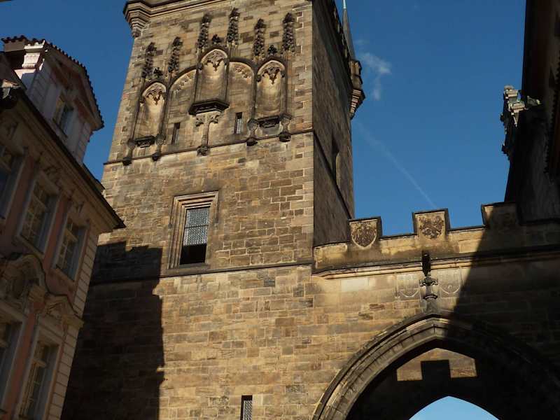Der jüngste Teil der Karlsbrücke ist der höhere der beiden Türme am Kleinseitner Moldauufer.Im Jahre 1464 auf Kosten von König Georg von Podiebrad erbaut,mußte ein älterer romanischer Turm weichen.Mit dem kleineren aber älteren Turm schützte er gemeinsam das Tor,durch das man die Kleinseite von Prag betrat.Die Türme dienten als Lager und Feuerwehrwacht.Der große Turm ist 43,5 Meter hoch,der Übergang findet man in einer Höhe von 26 Metern. Der Architekt Josef Mocker gestaltete sein heutiges Aussehen,in den Jahren von 1879-1883.